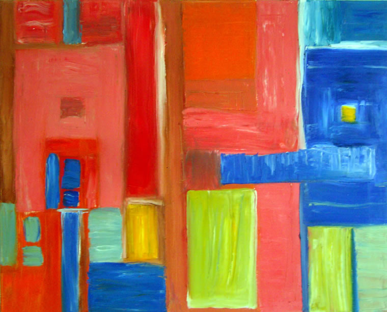 he building, started as landscape ended as portrait. But can be hanged anywhere anyhow. Some experiment with grey and purple colours. Block style also used in the La Calle painting.