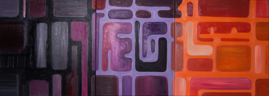 ound a lot of tape and 3 square paintings, one painted black, one purple and one orange. Screw the three together and started taping. After that, I colored the un-taped areas with all kind of purples, reds and blacks. After painting, immediately I removed the tape and let it rest for two days. Was not happy about the borders and rounded them, was not happy with the base colors (underneath the once taped areas) and painted them again a little bit brighter. Now it looks like a sixties or seventies wall. Nothing wrong with that. Had to use Photoshop to make the picture better, the flash gave it too many highlights I had to tone down. Painting info