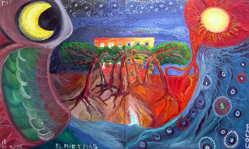 his work symbolises the house and garden in Salou. I lived in the house for a few weeks. I did some renovation work on the house and made some paintings. The title, “el mar y más” means “the sea and more”. This work is made out of 2 canvases, screwed together. Again, I had Van Gogh in mind. More works of Vincent van Gogh can be seen online or live in the Van Gogh museum. Very nice site.